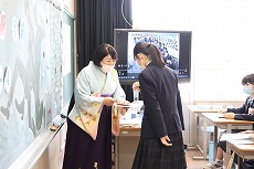 新型コロナ感染症対策のため1、2年生は会場での参加はできませんでしたが、オンラインで各教室から卒業式の様子を視聴しました。