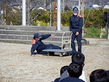 署員の方が台車を使って地震の揺れを再現し、安全に頭を守るための指導をしてくださいました。